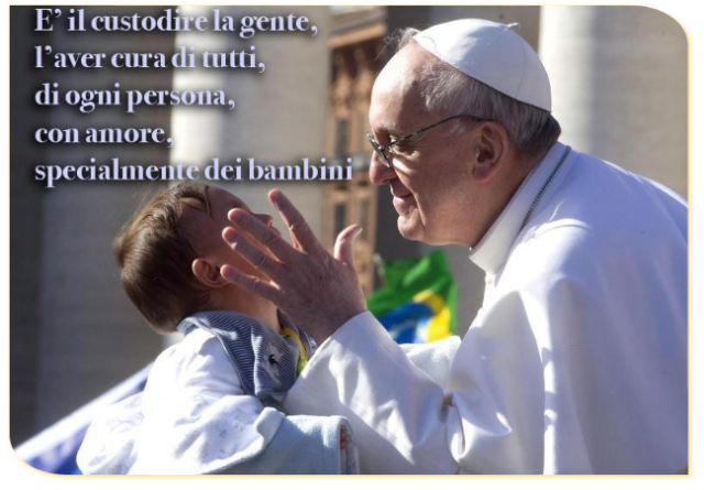 “E’ il custodire l’intero creato, la bellezza del creato, come ci viene detto nel Libro della Genesi e come ci ha mostrato San Francesco d’Assisi: è l’avere rispetto per ogni creatura di Dio e per l’ambiente in cui viviamo. E’ il custodire la gente, l’aver cura di tutti, di ogni persona, con amore, specialmente dei bambini, dei vecchi, di coloro che sono più fragili e che spesso sono nella periferia del nostro cuore”.