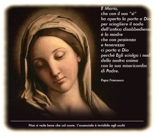 E Maria, che con il suo "sì" ha aperto la porta a Dio per sciogliere il nodo dell’antica disobbedienza, è la madre che con pazienza e tenerezza ci porta a Dio perché Egli sciolga i nodi della nostra anima con la sua misericordia di Padre.